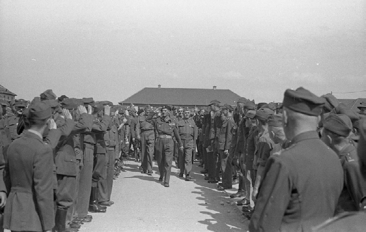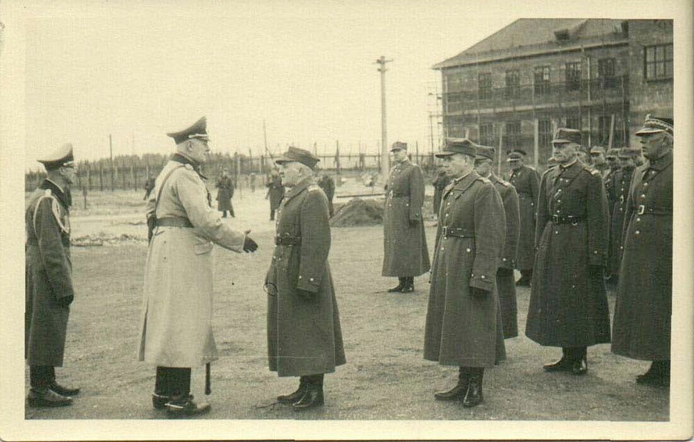 Слева высокопоставленный немецкий офицер, справа выстроились польские военнопленные офицеры, один из них делает доклад, немецкий офицер пожимает ему руку.
