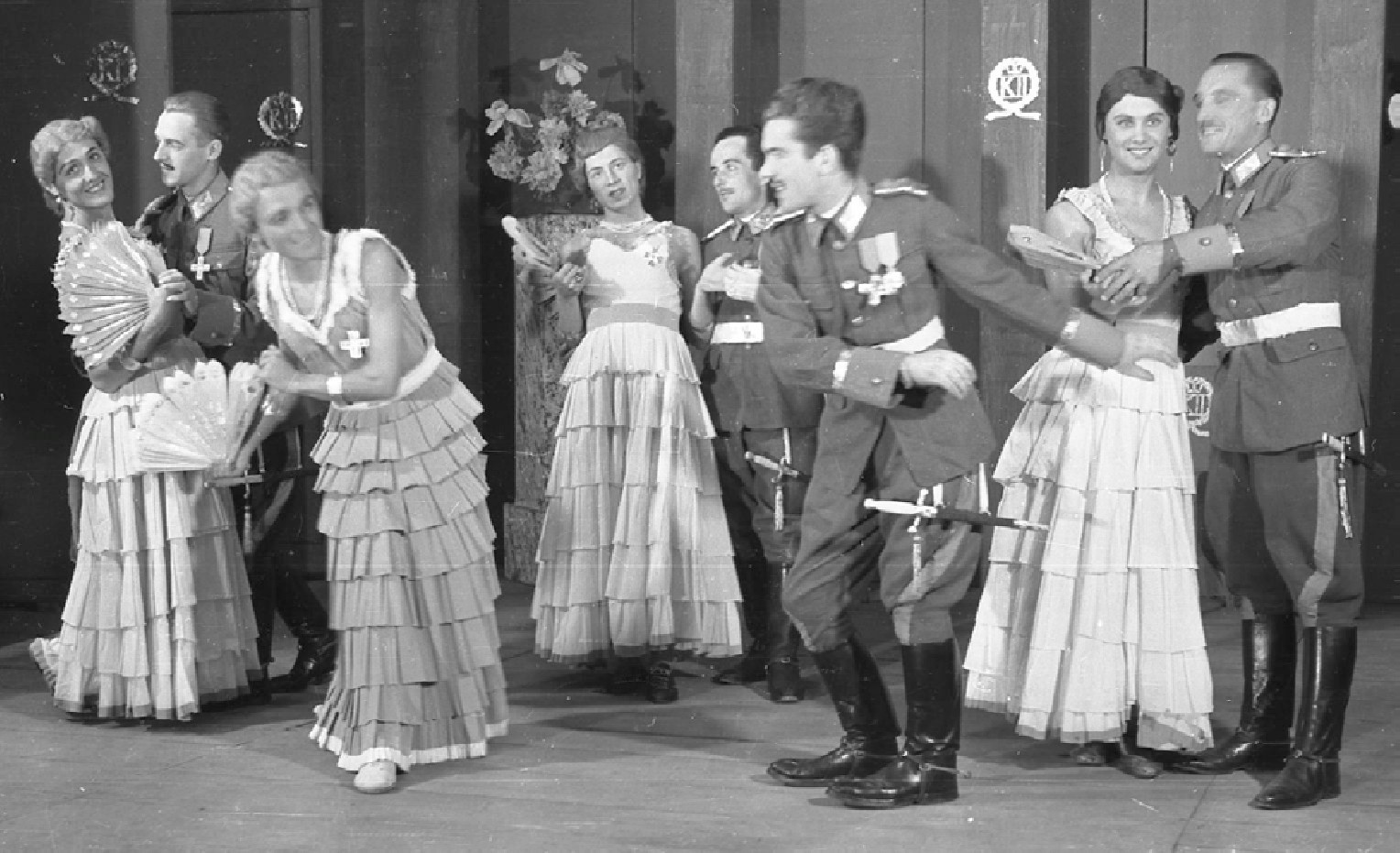 Платья в рюшечку вместо военной формы: для всеобщего удовольствия военнопленные ставили спектакли и оперетты. Но, поскольку в Мунрау не было военнопленных женщин, женские роли исполнялись мужчинами, переодевавшимися в женские одежды. Видно, что их это очень веселило.